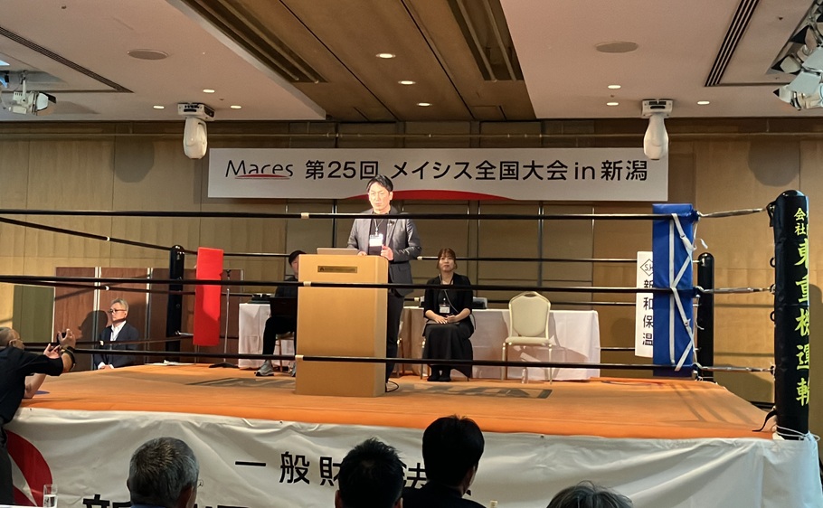 2025年7月18日(金)、全国の独立系広告会社ネットワーク「メイシス」が「第25回メイシス全国大会」を新潟市のホテル日航新潟で開催し、当社社員も参加しました。当日は地方創生に関する基調講演や、加盟社の優れた取り組みに対する「メイシス賞」の発表と表彰、そして予選、準決勝を勝ち抜いた3社による「第1回メイシスプレゼンバトル決勝」が行なわれ、当社執行役員の八重嶋が特設リングの上でプレゼンを行いました。会場は一日を通して熱気に包まれました。